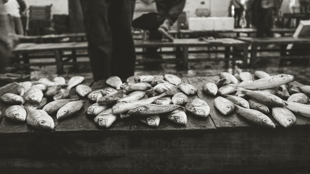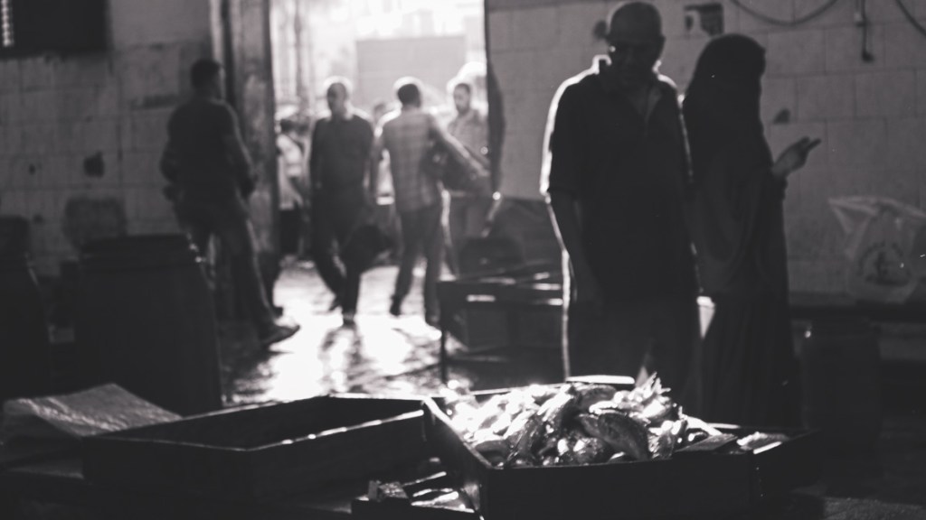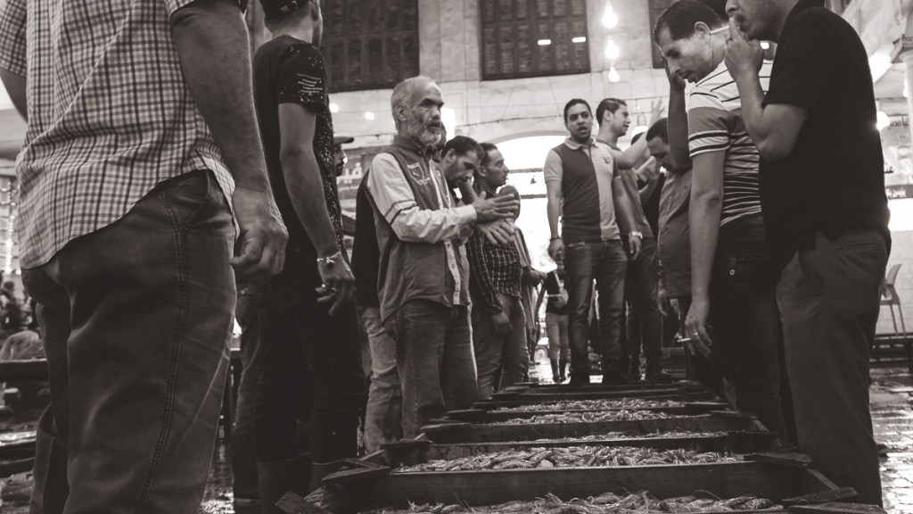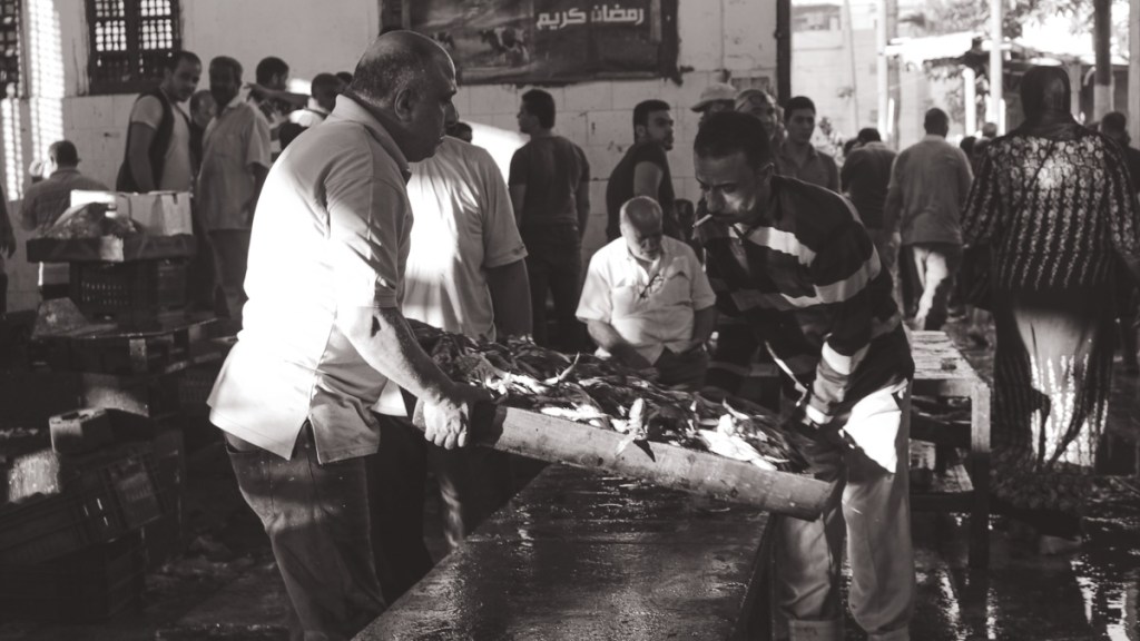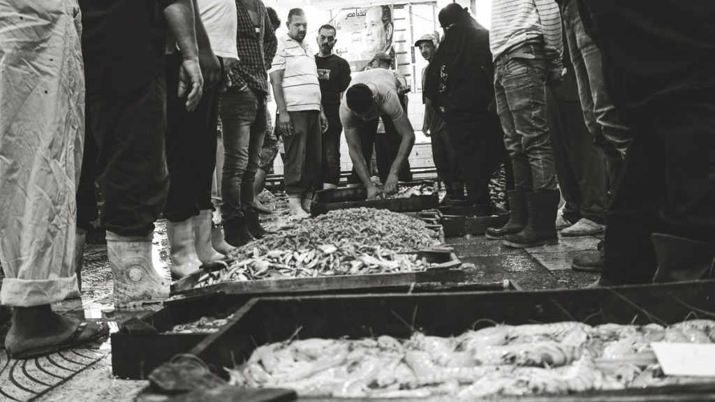 Every day, the Fish ring at Elanfushi in Alexandria, near the Qaitbay citadel, is bustling with fishermen’s boats loaded with different types of fish. Workers quickly unload the fish as soon as the sun rises. The place gets crowded as big merchants set up next to each other, displaying their goods. People looking to sell the fish gather around them to buy fresh fish that they can later sell to eager buyers.